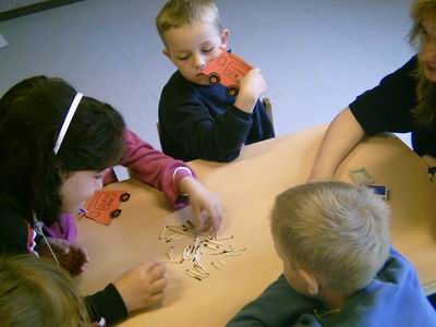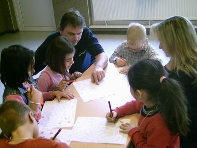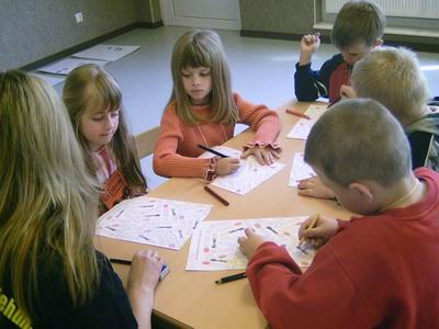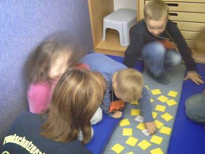 | Steffi und Uwe malen mit den Kindern Bilder von kaputten und ganzen Streichhölzern aus. | |
