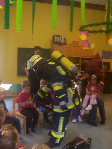 | Steffen begrüßt die Kinder in der Ausrüstung eines Atemschutzgeräteträgers. | |