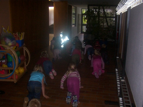 | Hier lernen die Kinder das richtige Verlassen eines verqualmten Raumes mit Steffen. |
