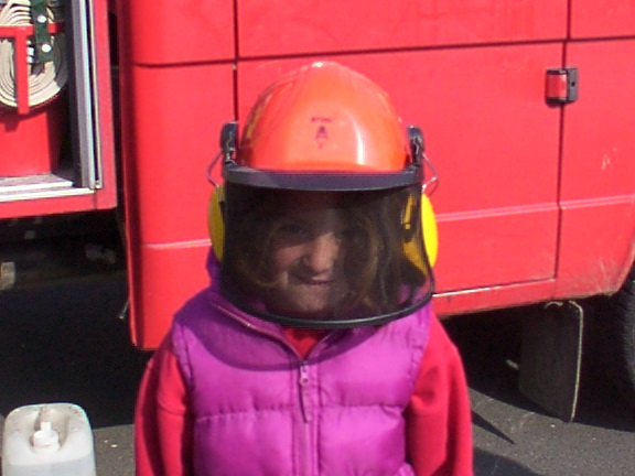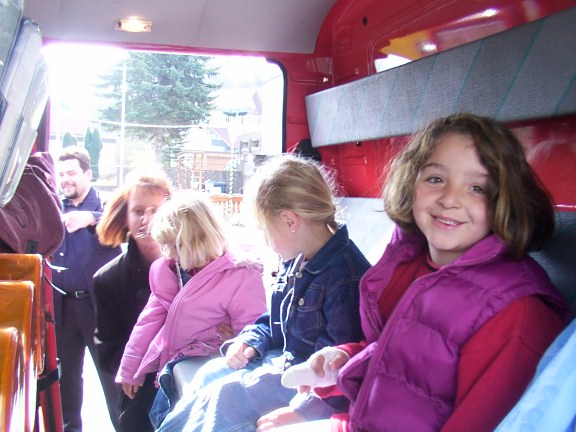 | Schau mal, wir sitzen im Feuerwehrauto. | |
